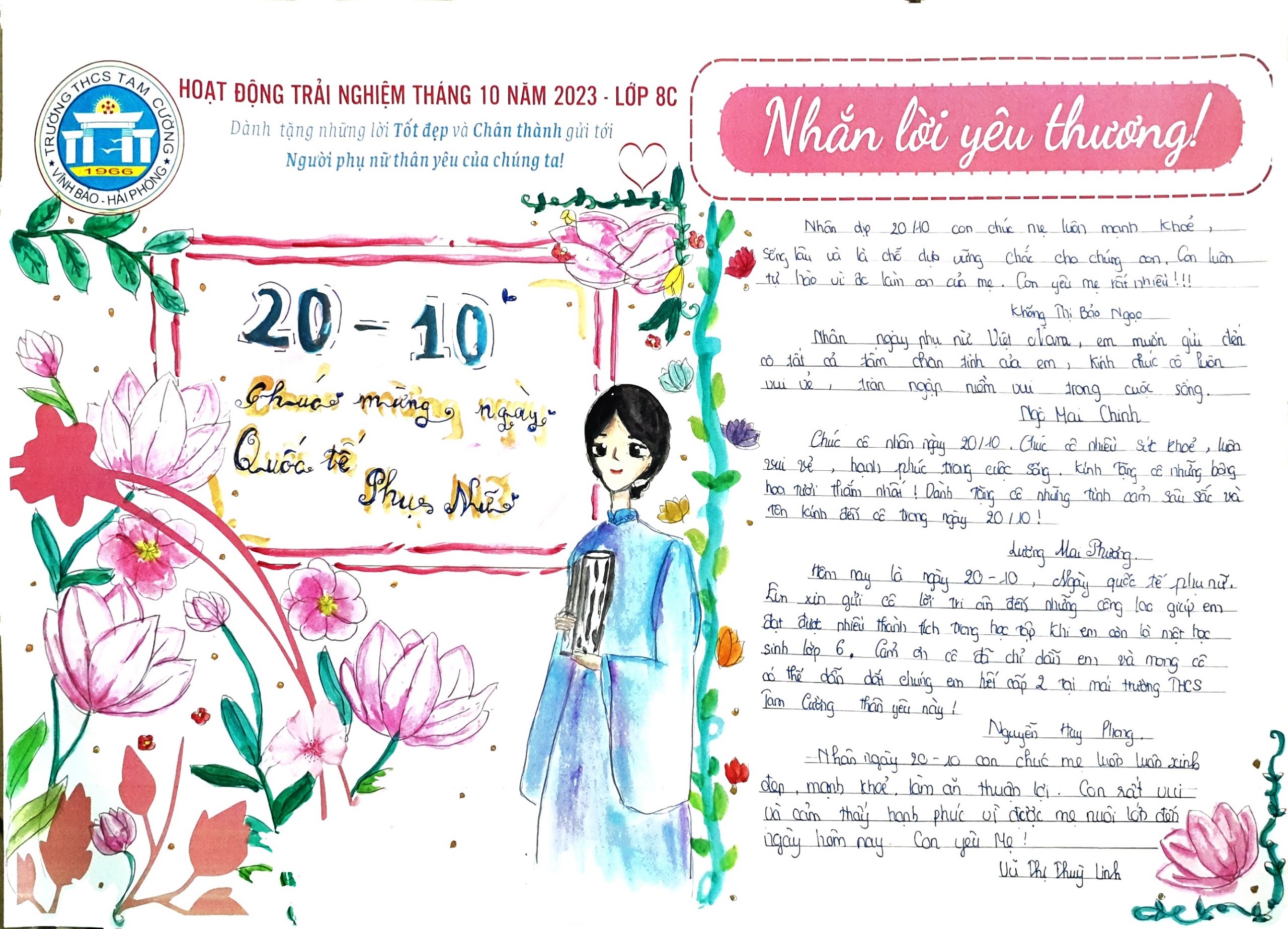 Từ cảm nhận sâu sắc về tình cảm, trách nhiệm, sự hy sinh lớn lao của những người phụ nữ thân yêu, các bạn học sinh trường THCS Tam Cường đã thể hiện sự kính trọng và biết ơn của mình một cách chân thành - giản dị - ý nghĩa bằng việc tham gia hoạt động trải nghiệm tháng 10 năm 2023 với chủ đề "Nhắn lời yêu thương". BBT trân trọng giới thiệu sản phẩm dự án của nhóm học sinh lớp 8C thực hiện trong trải nghiệm này.