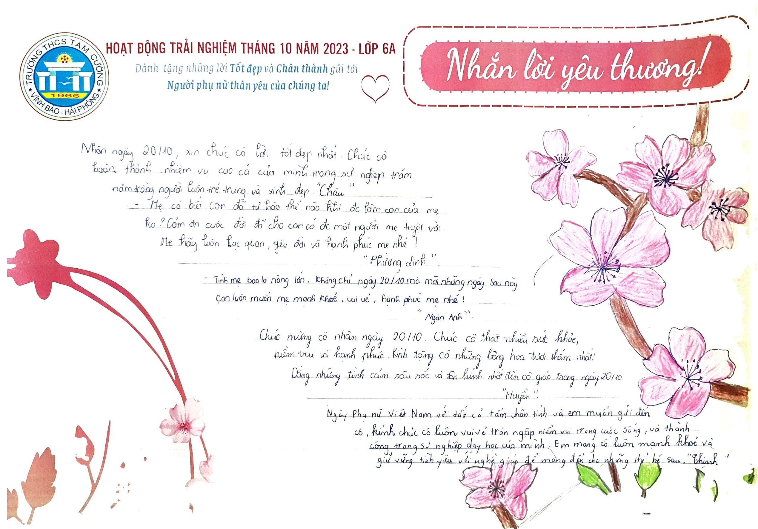 Từ cảm nhận sâu sắc về tình cảm, trách nhiệm, sự hy sinh lớn lao của những người phụ nữ thân yêu, các bạn học sinh trường THCS Tam Cường đã thể hiện sự kính trọng và biết ơn của mình một cách chân thành - giản dị - ý nghĩa bằng việc tham gia hoạt động trải nghiệm tháng 10 năm 2023 với chủ đề "Nhắn lời yêu thương". BBT trân trọng giới thiệu sản phẩm dự án của nhóm học sinh lớp 6A thực hiện trong trải nghiệm này.