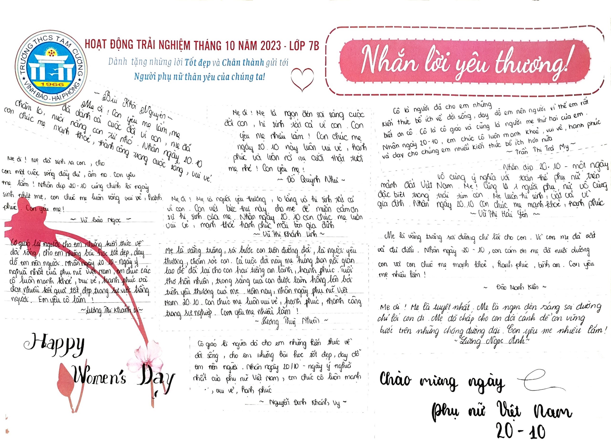 Từ cảm nhận sâu sắc về tình cảm, trách nhiệm, sự hy sinh lớn lao của những người phụ nữ thân yêu, các bạn học sinh trường THCS Tam Cường đã thể hiện sự kính trọng và biết ơn của mình một cách chân thành - giản dị - ý nghĩa bằng việc tham gia hoạt động trải nghiệm tháng 10 năm 2023 với chủ đề "Nhắn lời yêu thương". BBT trân trọng giới thiệu sản phẩm dự án của nhóm học sinh lớp 7B thực hiện trong trải nghiệm này.