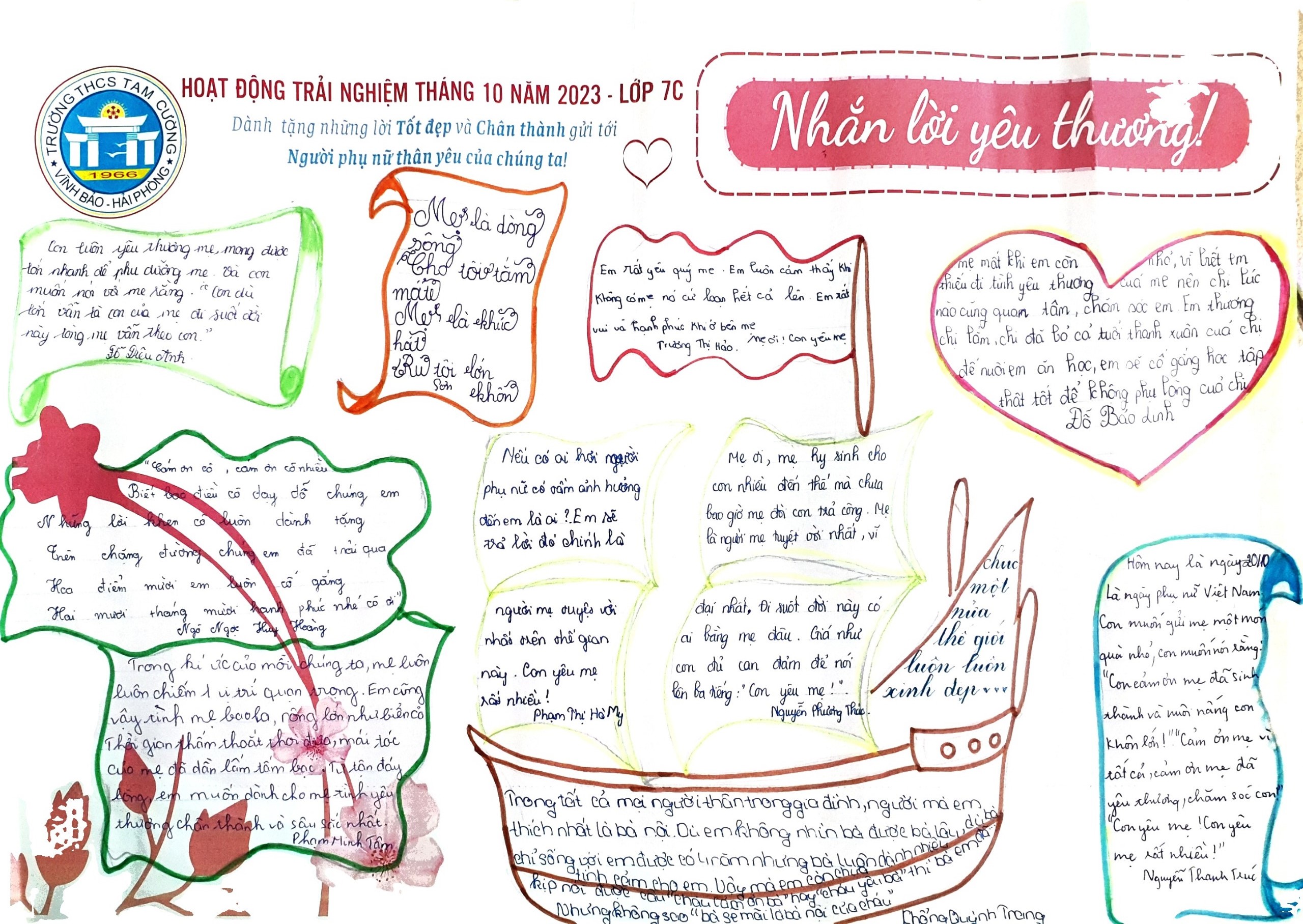 Từ cảm nhận sâu sắc về tình cảm, trách nhiệm, sự hy sinh lớn lao của những người phụ nữ thân yêu, các bạn học sinh trường THCS Tam Cường đã thể hiện sự kính trọng và biết ơn của mình một cách chân thành - giản dị - ý nghĩa bằng việc tham gia hoạt động trải nghiệm tháng 10 năm 2023 với chủ đề "Nhắn lời yêu thương". BBT trân trọng giới thiệu sản phẩm dự án của nhóm học sinh lớp 7A thực hiện trong trải nghiệm này.