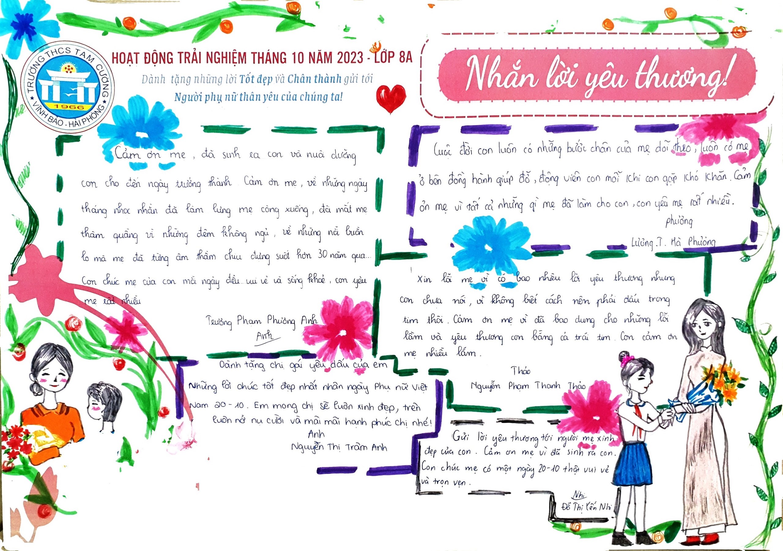 Từ cảm nhận sâu sắc về tình cảm, trách nhiệm, sự hy sinh lớn lao của những người phụ nữ thân yêu, các bạn học sinh trường THCS Tam Cường đã thể hiện sự kính trọng và biết ơn của mình một cách chân thành - giản dị - ý nghĩa bằng việc tham gia hoạt động trải nghiệm tháng 10 năm 2023 với chủ đề "Nhắn lời yêu thương". BBT trân trọng giới thiệu sản phẩm dự án của nhóm học sinh lớp 8A thực hiện trong trải nghiệm này.
