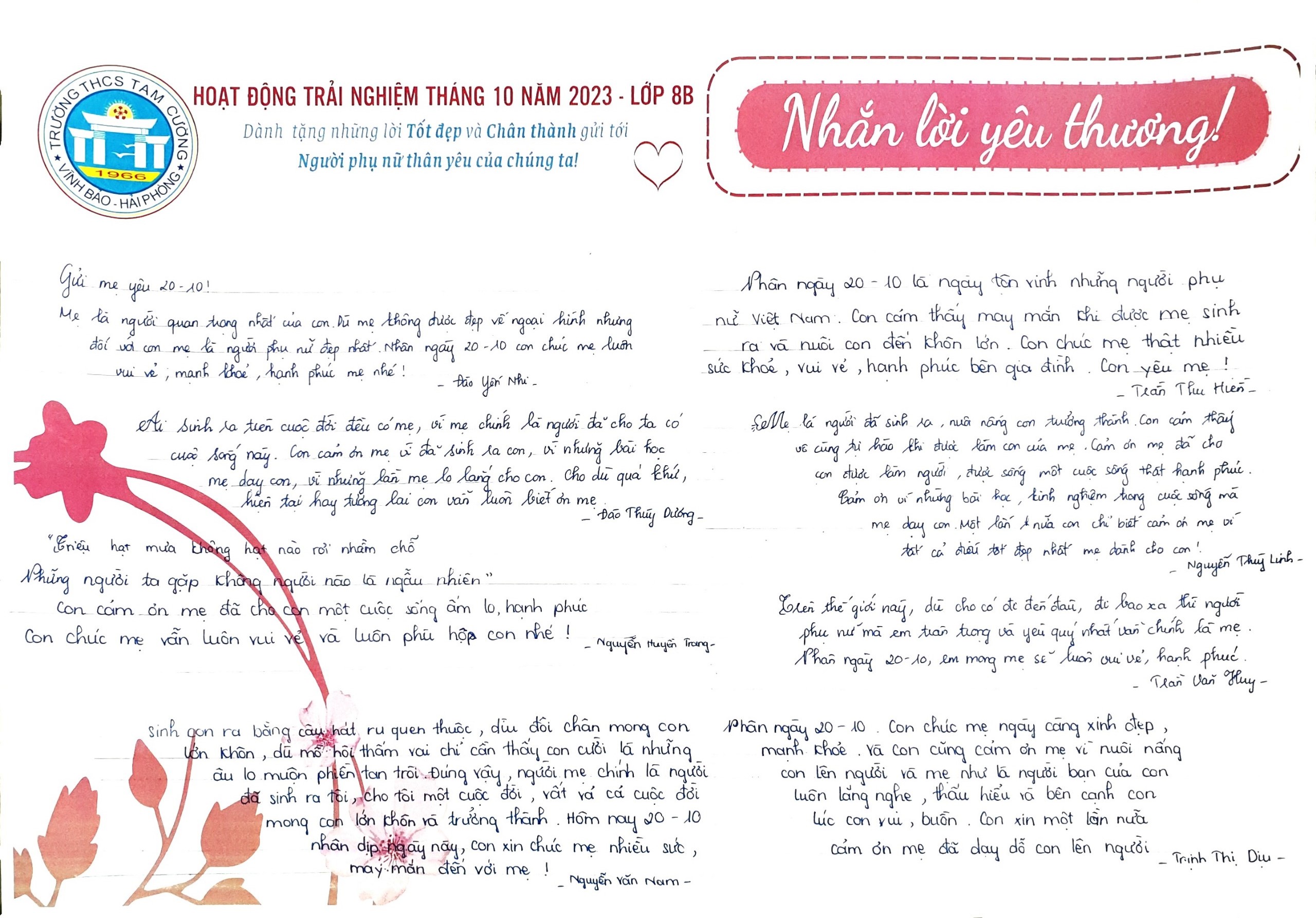 Từ cảm nhận sâu sắc về tình cảm, trách nhiệm, sự hy sinh lớn lao của những người phụ nữ thân yêu, các bạn học sinh trường THCS Tam Cường đã thể hiện sự kính trọng và biết ơn của mình một cách chân thành - giản dị - ý nghĩa bằng việc tham gia hoạt động trải nghiệm tháng 10 năm 2023 với chủ đề "Nhắn lời yêu thương". BBT trân trọng giới thiệu sản phẩm dự án của nhóm học sinh lớp 8B thực hiện trong trải nghiệm này.