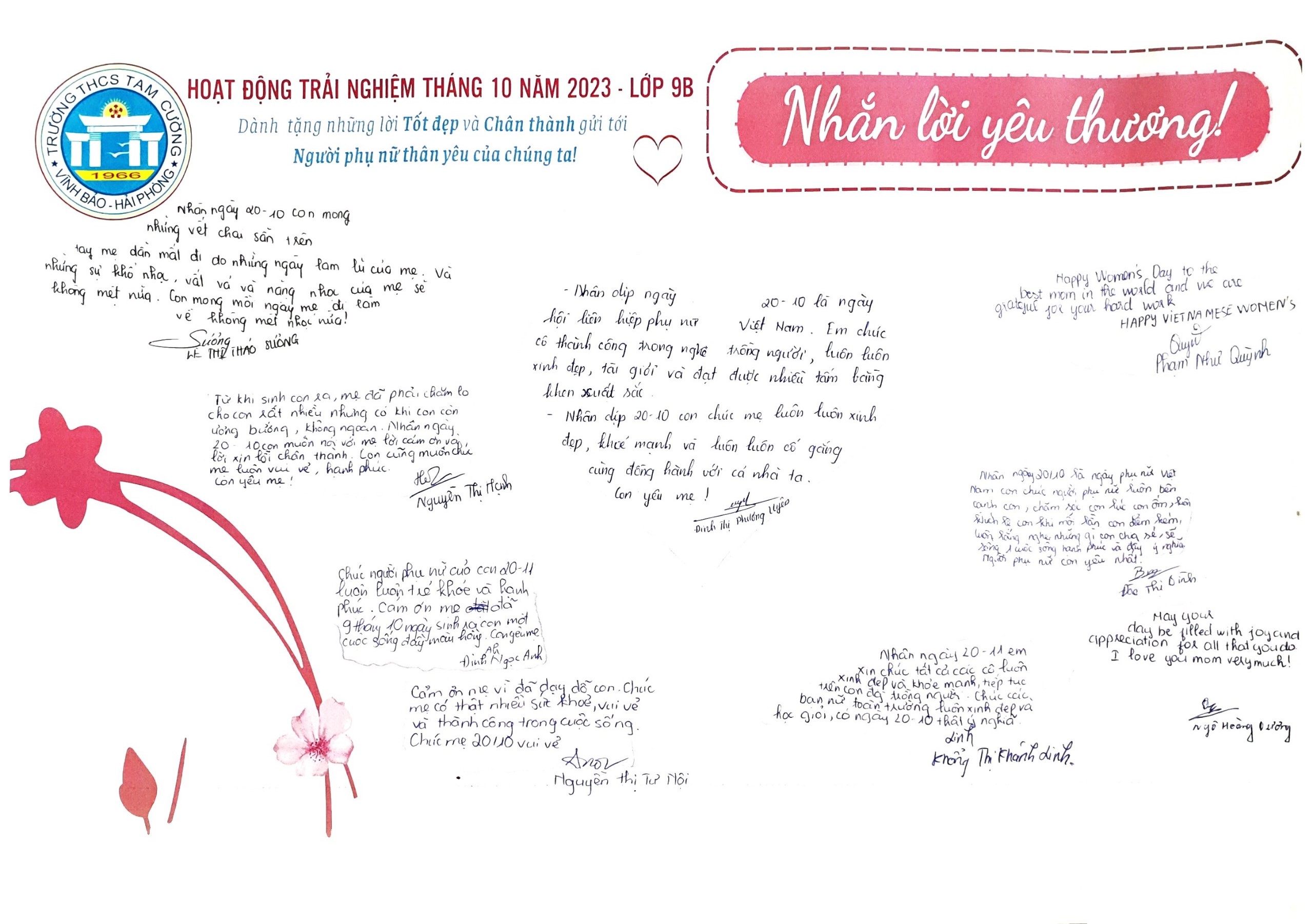 Từ cảm nhận sâu sắc về tình cảm, trách nhiệm, sự hy sinh lớn lao của những người phụ nữ thân yêu, các bạn học sinh trường THCS Tam Cường đã thể hiện sự kính trọng và biết ơn của mình một cách chân thành - giản dị - ý nghĩa bằng việc tham gia hoạt động trải nghiệm tháng 10 năm 2023 với chủ đề "Nhắn lời yêu thương". BBT trân trọng giới thiệu sản phẩm dự án của nhóm học sinh lớp 9B thực hiện trong trải nghiệm này.